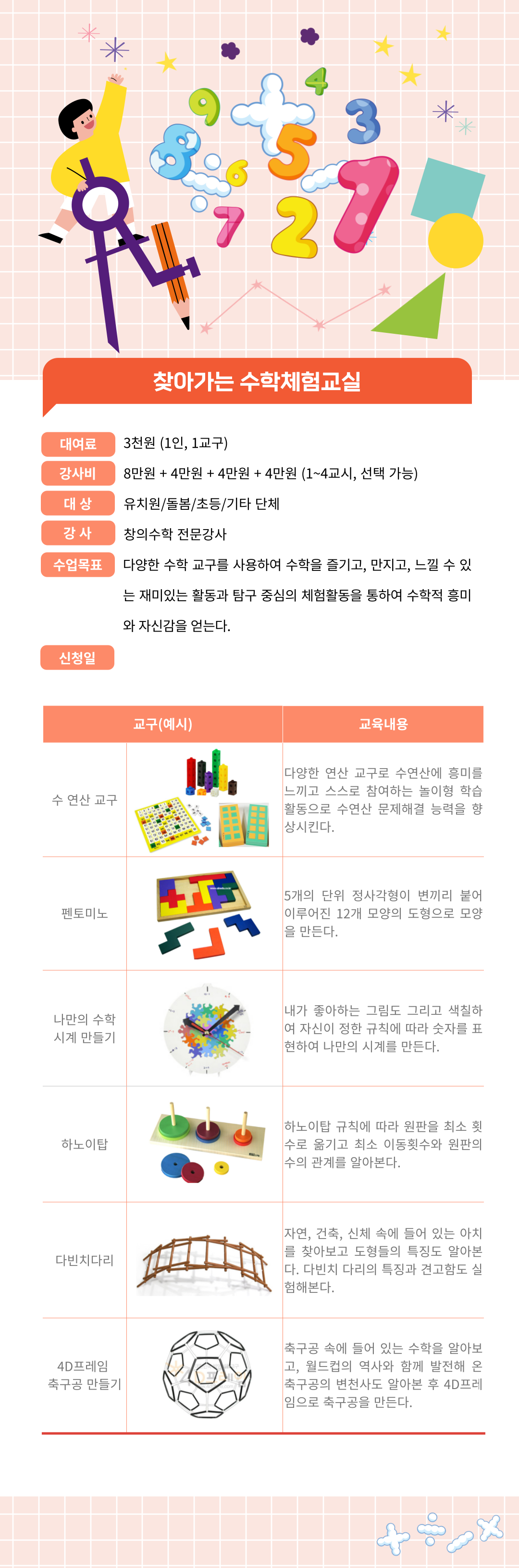 다양한 수학 교구를 사용하여 수학을 즐기고, 만지고, 느낄 수 있는 재미있는 활동과 탐구 중심의 체험활동