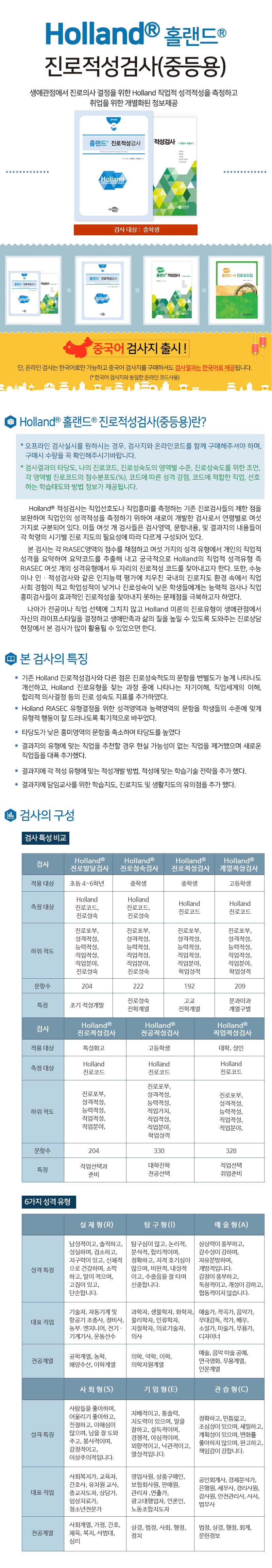 Holland 직업적 성격 적성인 RIASEC 유형을 변별도 높게 찾아내어 적성에 맞는 진로, 직업 추천을 통해 진로유형을 생애관점에서 라이프 스타일을 결정하고 생애 만족과 삶의 질을 높일 수 있는 검사임.