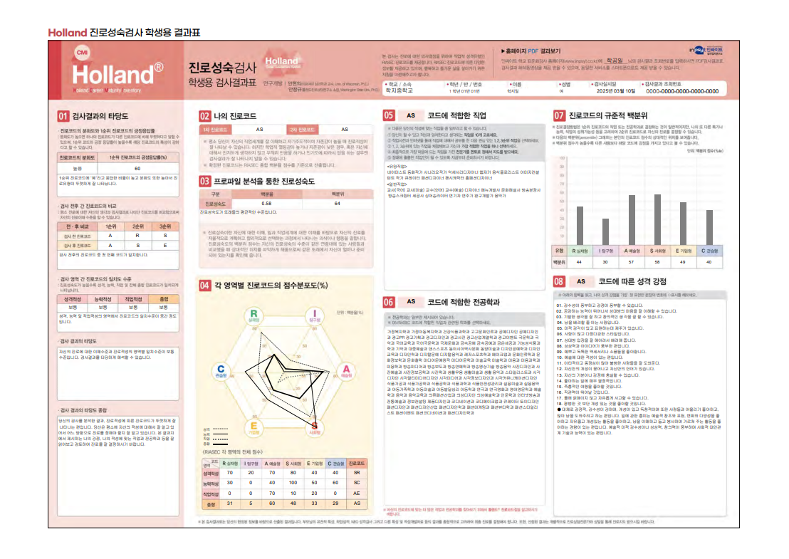 [Holland 진로성숙검사 학생용 결과표 예시]
